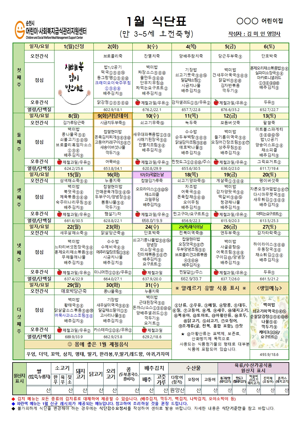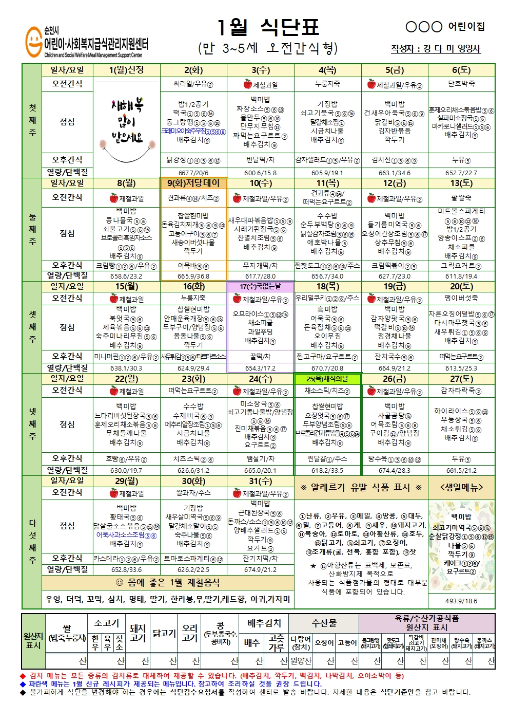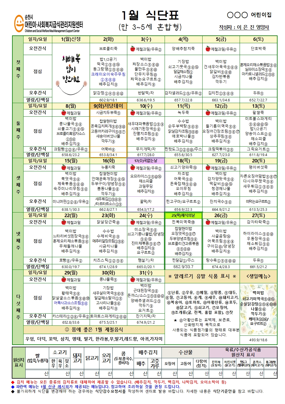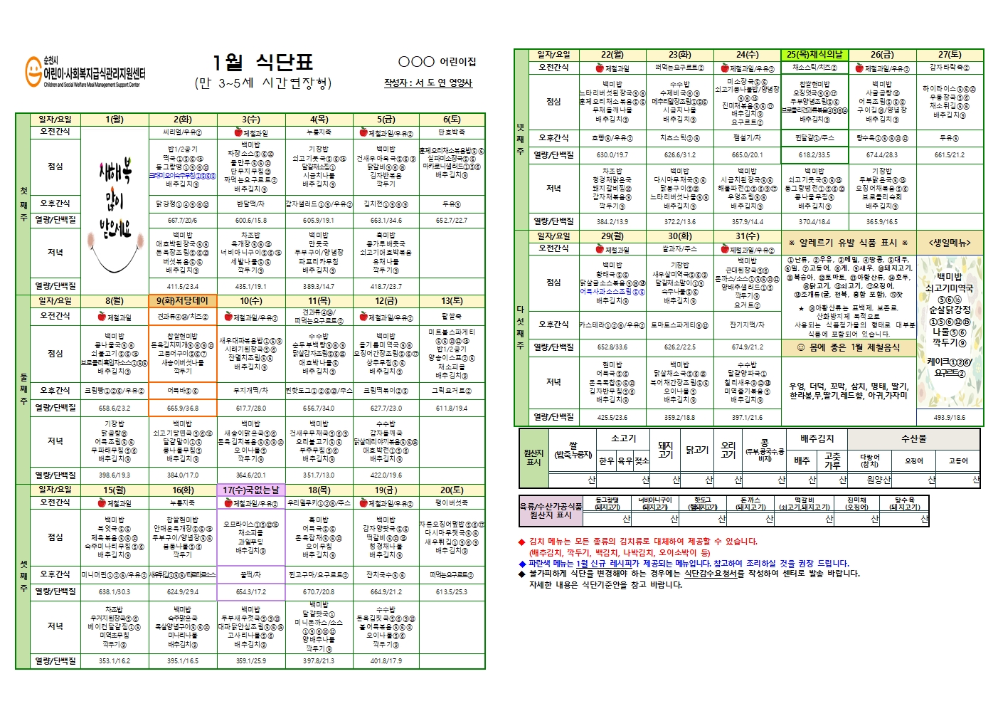 순천시어린이사회복지급식관리지원센터 "2024년 1월 3~5세 식단"