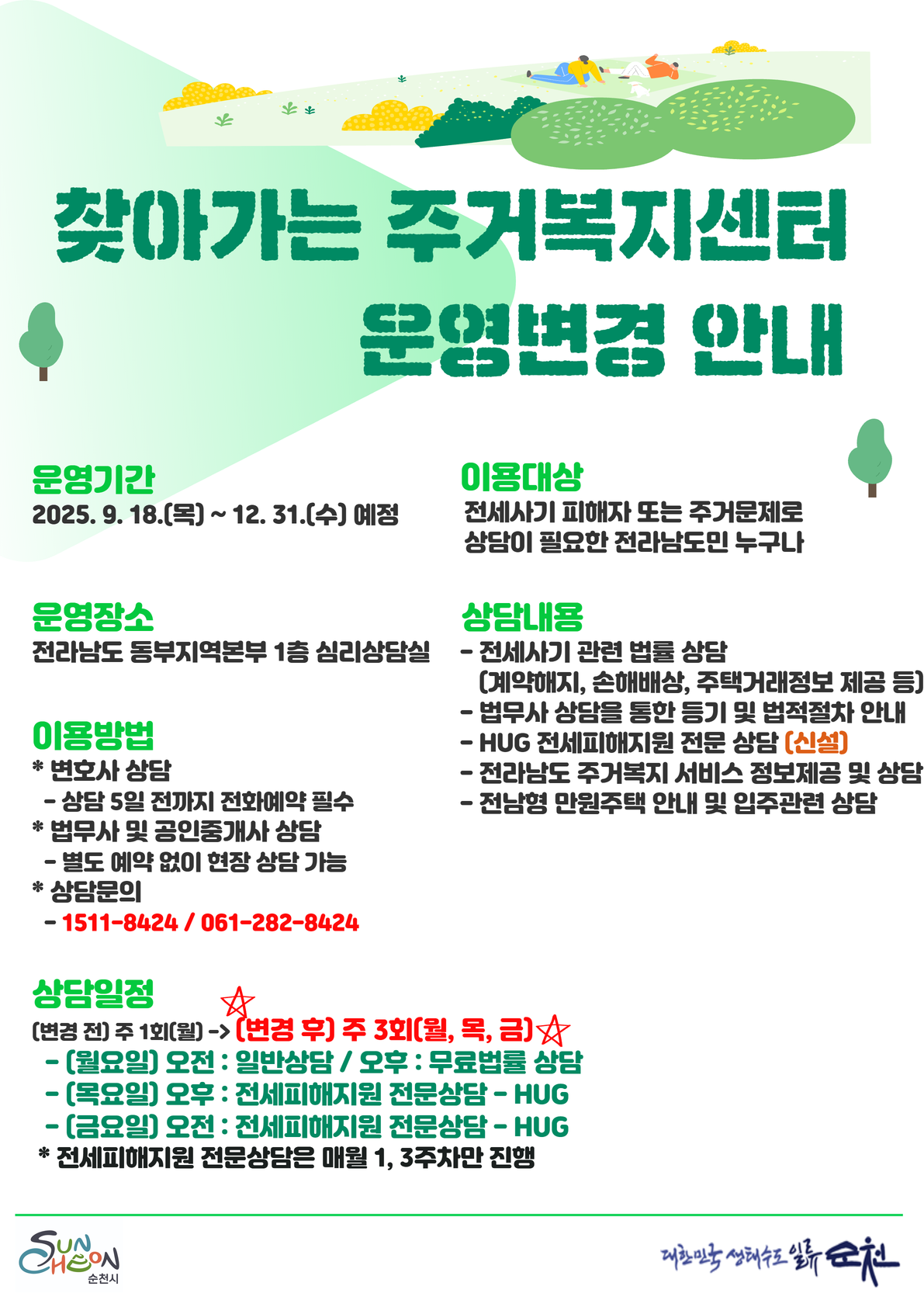 상담문의 : 1511-8424 / 061-282-8424 (전라남도 주거복지센터)